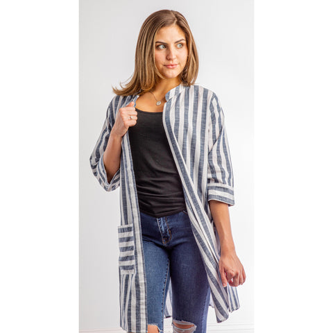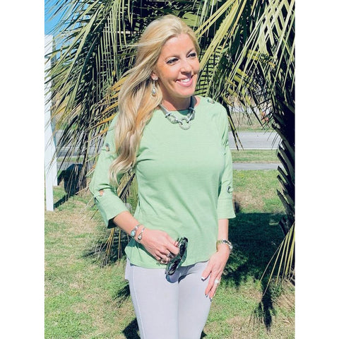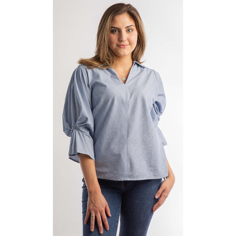 Our Bleu Skies 3/4 sleeved top is sure to brighten up your look and satisfy all your styling needs! Stunning "bleu" and white splatter print covers the top as it falls from a v-neck line and scrunches at. the sleeves. Twisted-tie front.